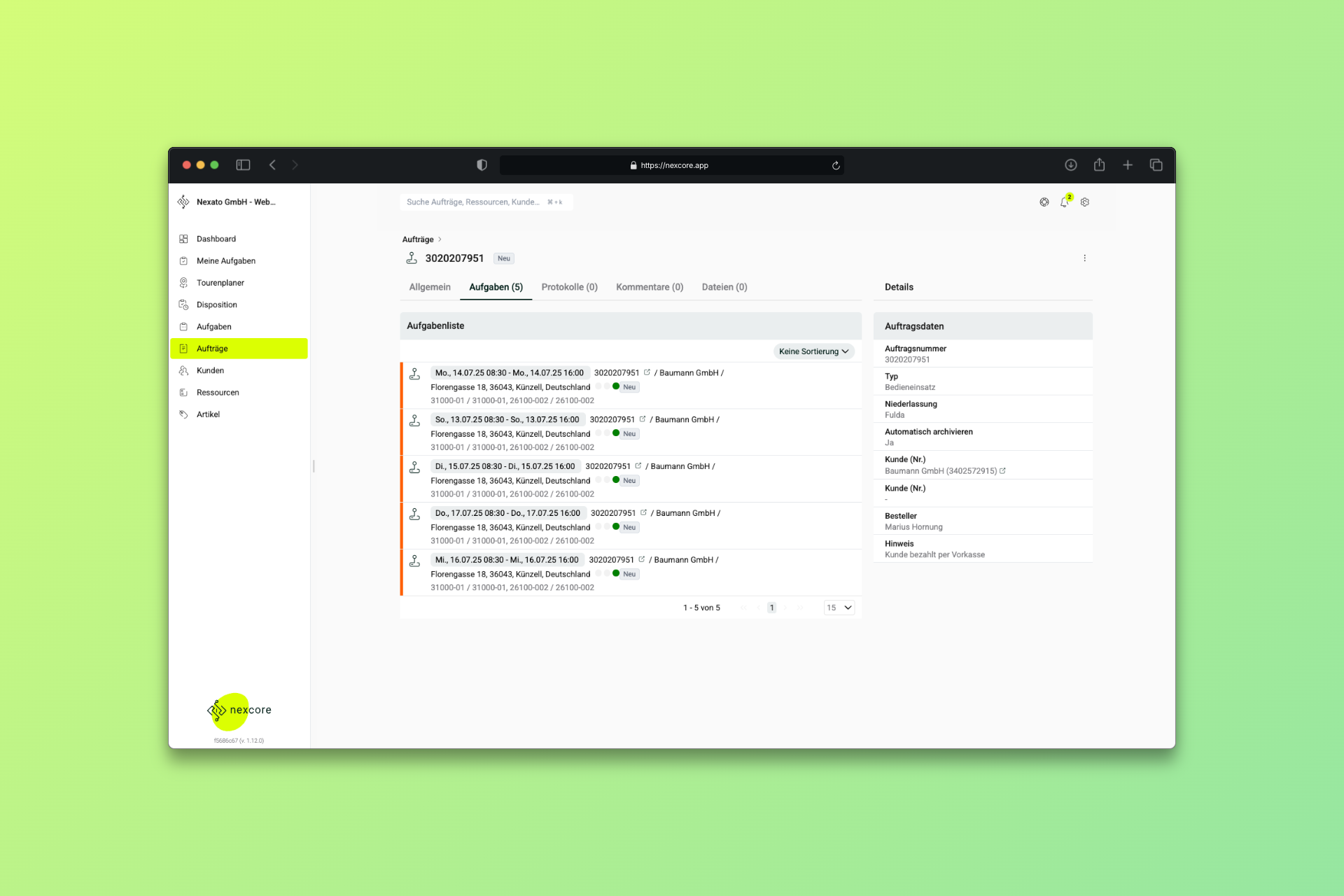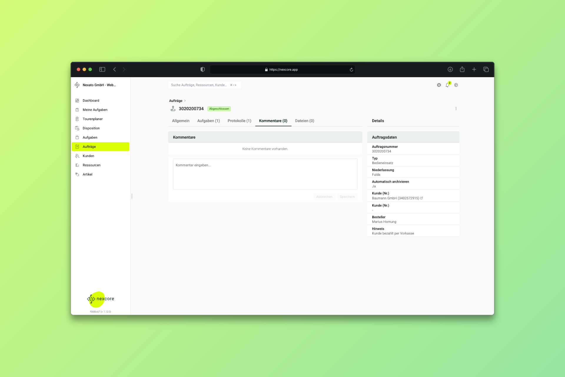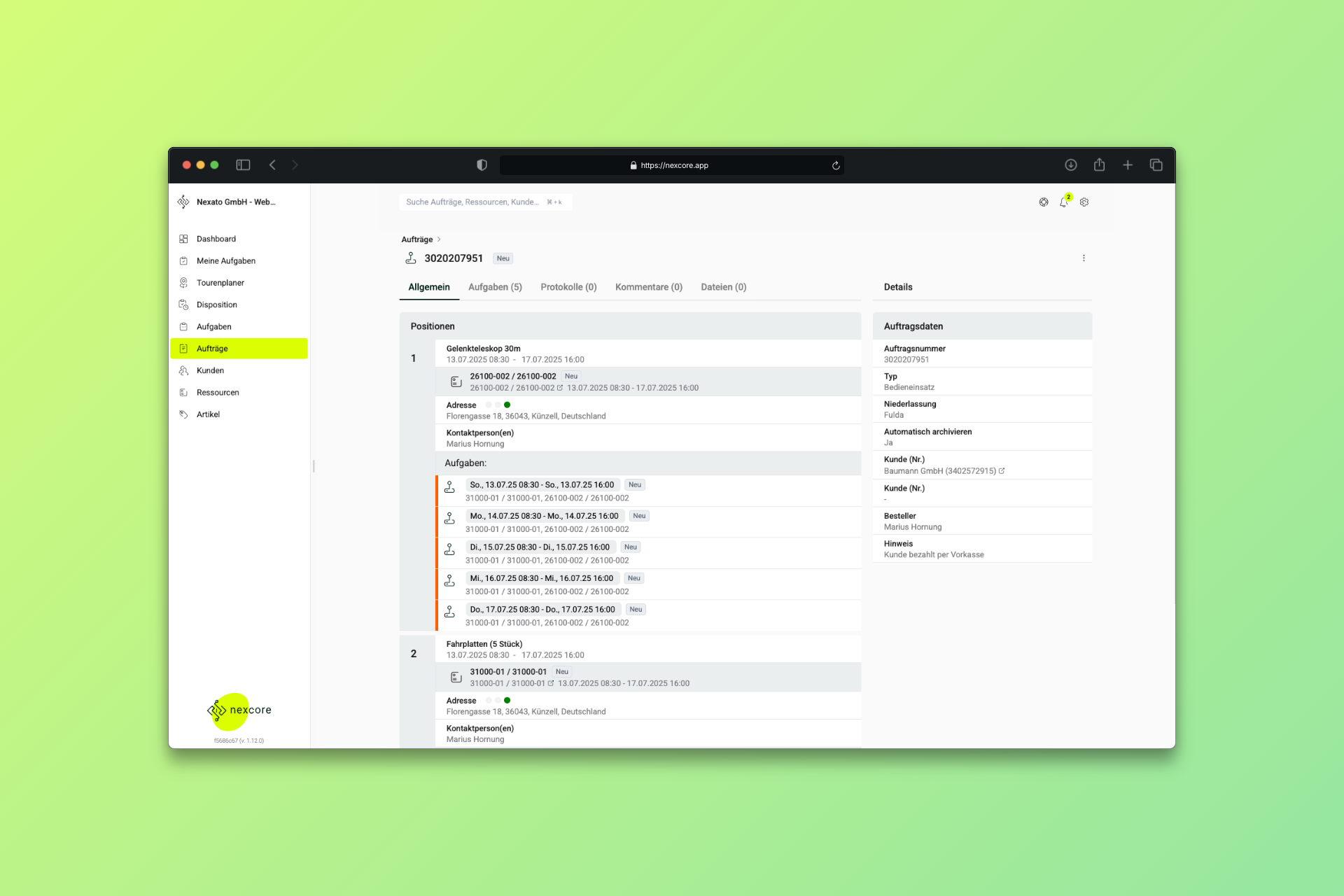 nexcore legt Auftrag, Positionen und Ressourcenzuweisungen automatisch an.