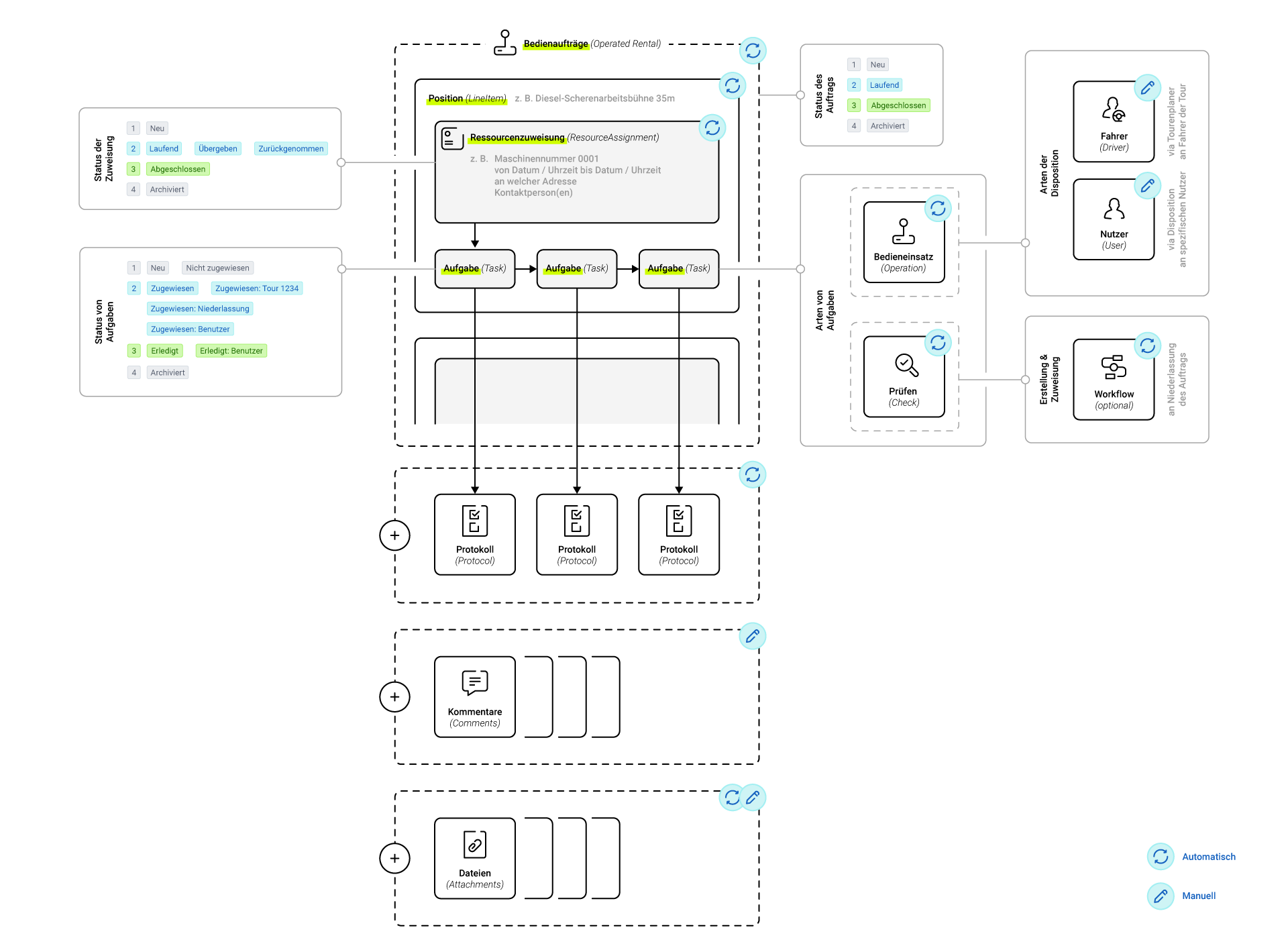 Jede Ebene hat einen eigenen Lebenszyklus und Status. Der Status des Bedienauftrags (Ebene 1) wird automatisch aus den Stati der zugehörigen Ressourcenzuweisungen und Aufgaben ermittelt.