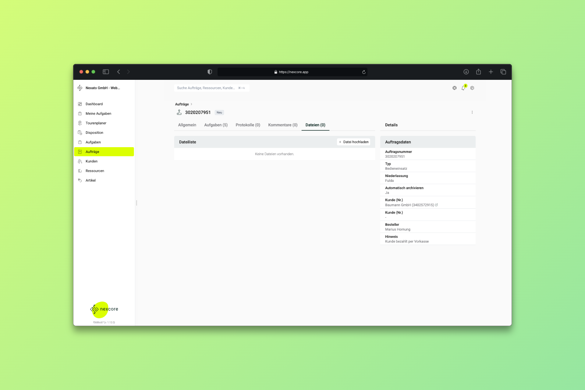 Grundlegende Informationen wie Auftragsnummer, Status, Niederlassung, Kunde, Ansprechpartner, Hinweise