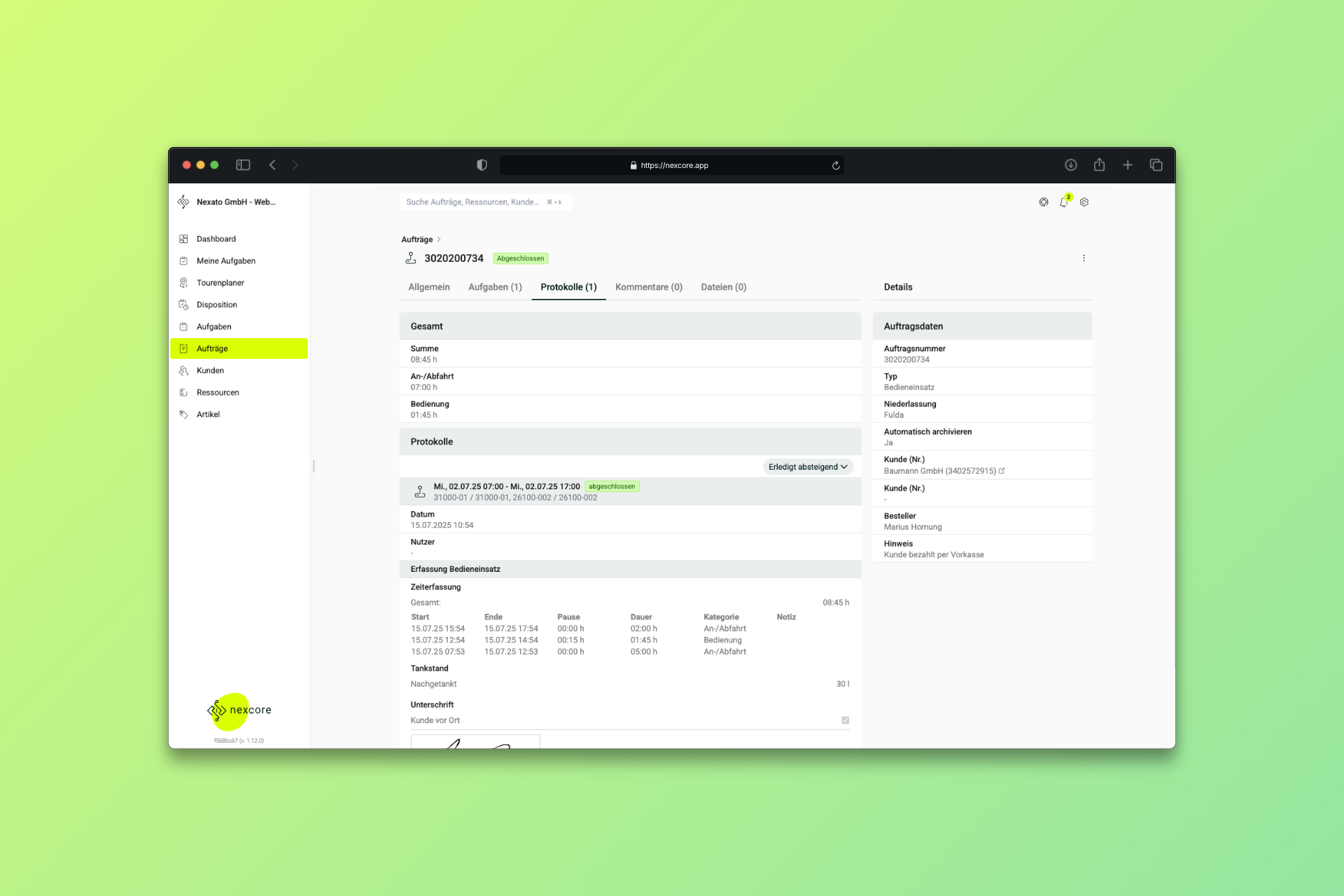 Enthält alle Eckdaten: Auftragstyp, Kunde, Ort, Zeitraum