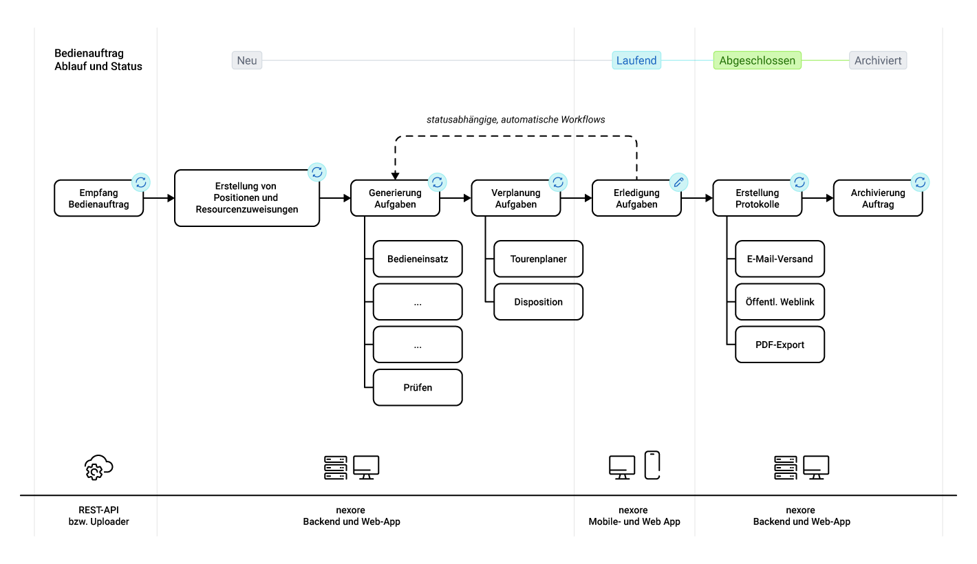 Bedienaufträge werden über die Schnittstelle bzw. den Uploader-Dienst an nexcore übermittelt. In Abhängigkeit von den Einstellungen zur Task-Erstellungs-Strategie generiert nexcore in diesem Moment automatisch zugehörige Aufgaben (Bedieneinsätze), die Du in der Web-App verplanen musst.